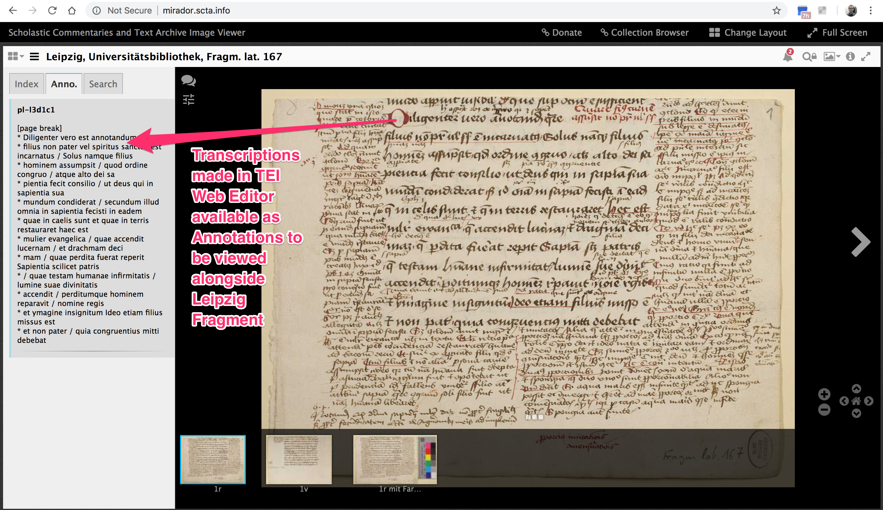 Beispielsweise können wir statt in einer Bild-zentrierten Applikation wie Mirador dieselben Daten ein zweites Mal in einem Text-zentrierten Interface anzeigen, bei dem die Bilder nunmehr als Annotationen erscheinen.
