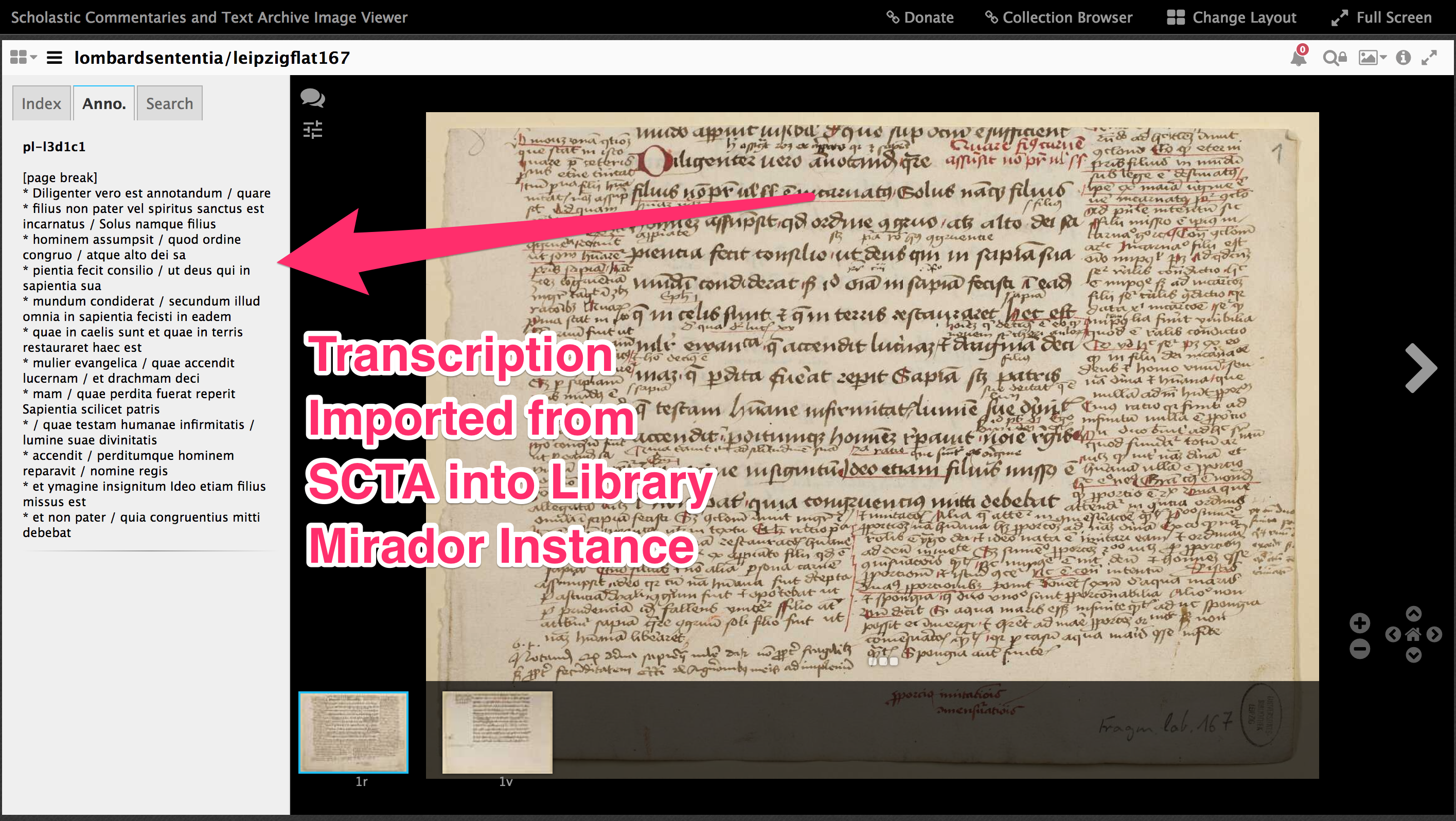 Mit IIIF sieht die Lage anders aus. Ein einzelnes Bild von diesem Zeugen, zur Verfügung gestellt vom Fragmentarium-Projekt in der Schweiz, wird für mich als Forscher unmittelbar nutzbar. Auf diese Art und Weise können wir alle mit unseren verschiedenen Interessen gewinnen. Denn Leipzig hat natürlich ein Interesse an all den Handschriften, die in Leipzig sind, Fragmentarium hat ein allgemeines Interesse an Fragmenten weltweit, und die SCTA hat ein Interesse an all den Handschriften, die Lombardus Text enthalten.